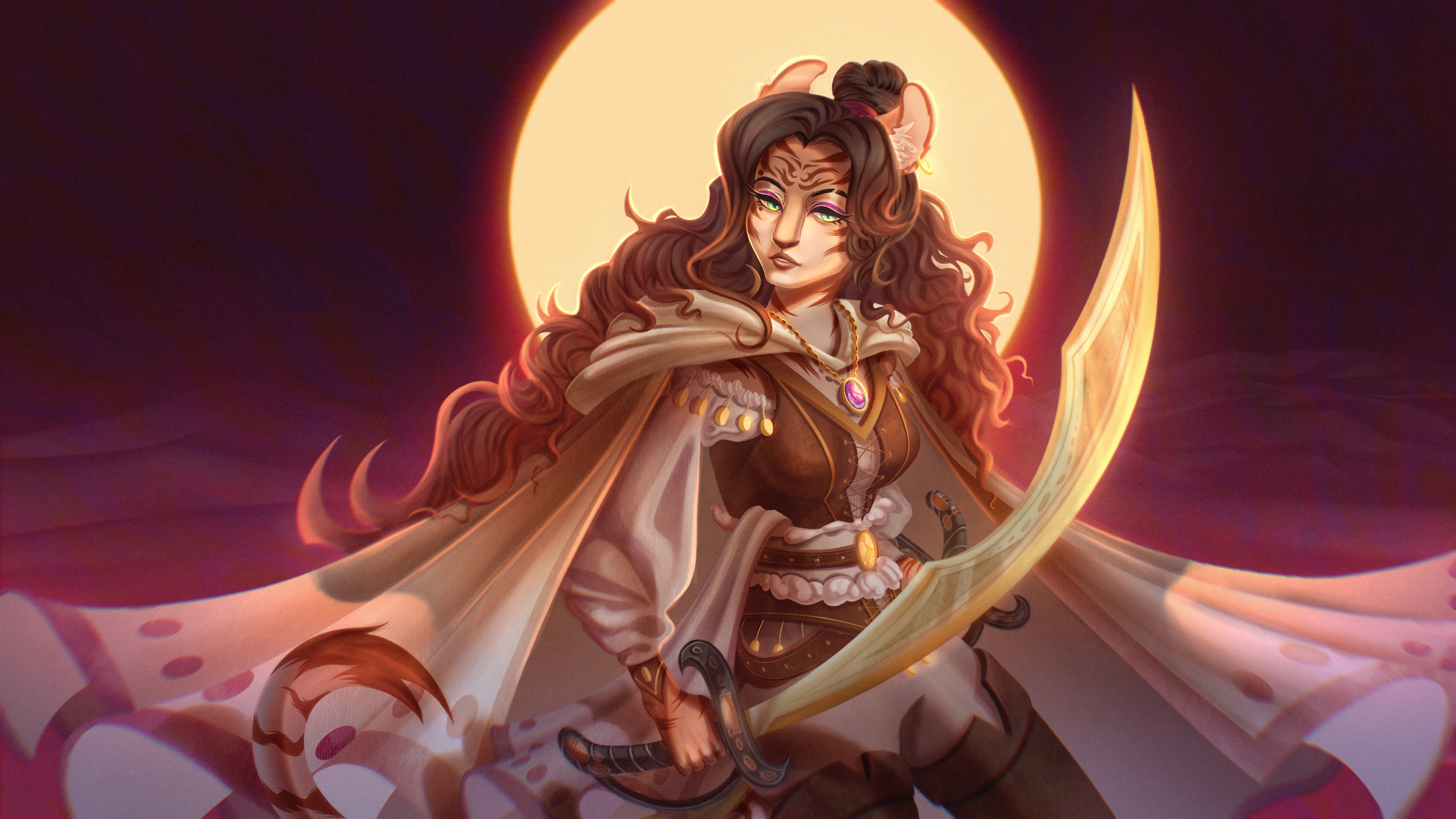 Rikaria Tavade, a Level 5 Rakshasha Tiefling Paladin